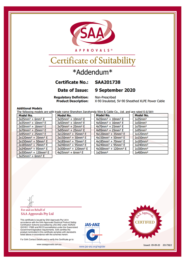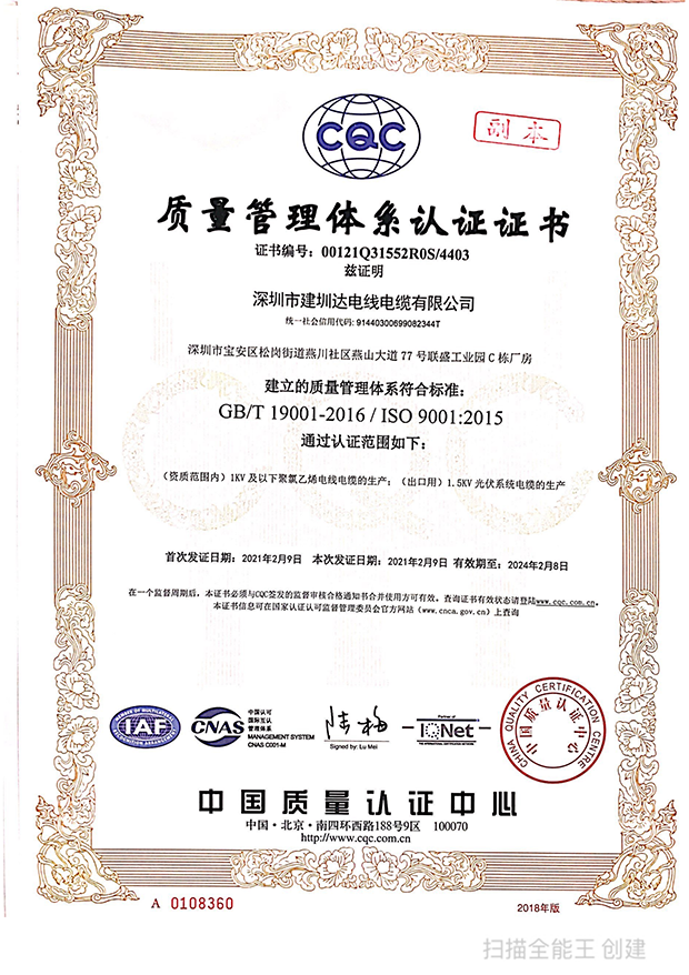 深圳建圳達電線電纜有限公司,成立于2000年,是一家電線電纜制造商,我們通過了世界各地不同市場的多數認證,如:CCC、RoHS、CB、SAA、TUV、VDE、PSE、BPS、UL、CSA。我們根據定制產品不斷更新新的認證。經過數十年的發(fā)展,我們與來自世界各地的客戶建立了長期的合作關系。我們曾經是菲律賓機場,,柬埔寨的電力站,美國的醫(yī)院,工廠,埃塞俄比亞的水電站項目。我們是一家值得信賴的電線供應商。